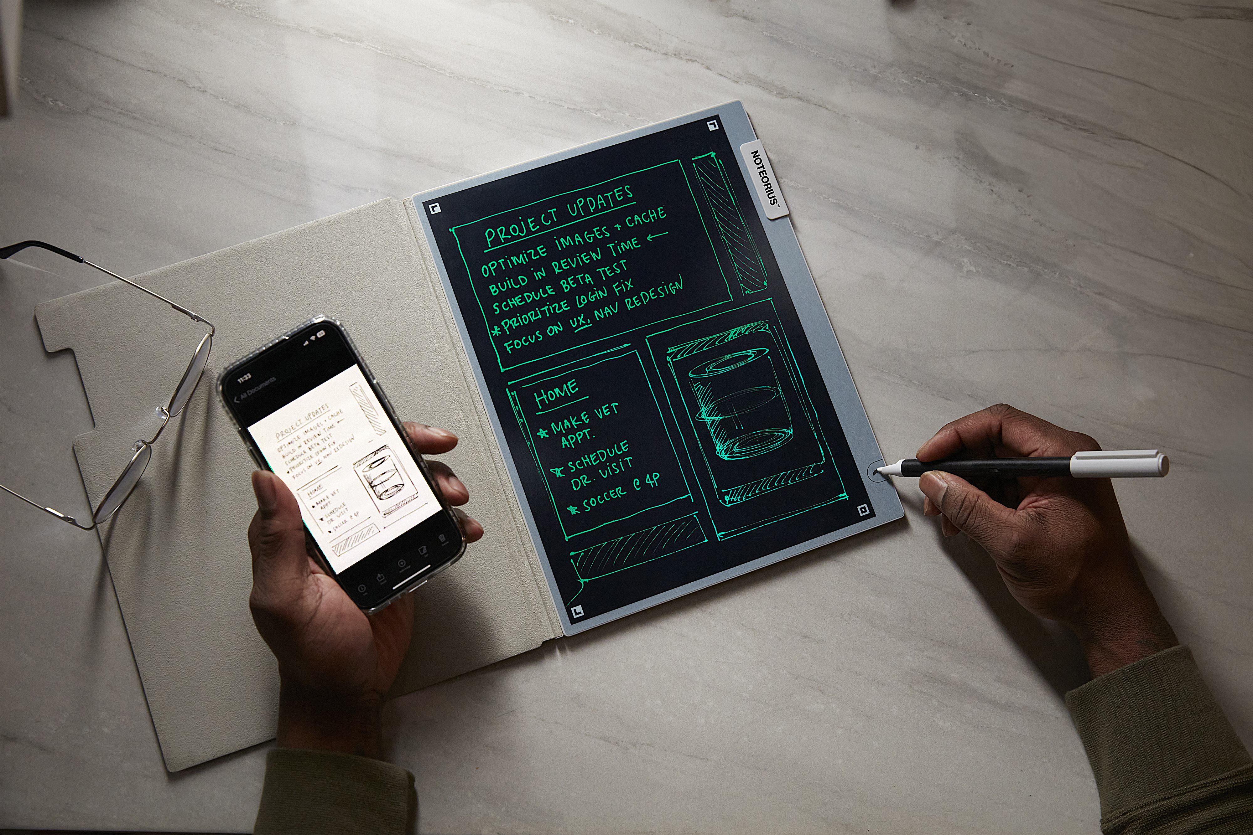 Every component of the Noteorius Stylus is designed for accuracy and responsiveness. A precision optical sensor captures each stroke instantly while the custom polymer nib recreates the controlled friction of pen on paper, giving you digital capture without sacrificing the feel of writing.